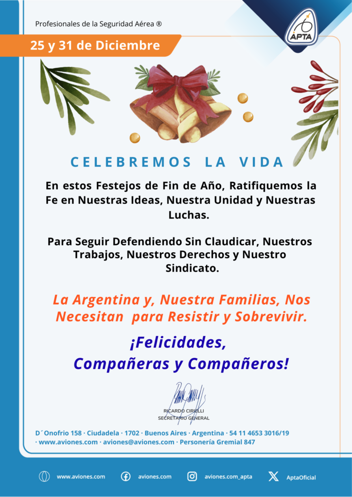 A TODOS LOS TÉCNICOS AERONÁUTICOS, DESPACHANTES DE AERONAVES Y CONTROLADORES AÉREOS. ¡FELICES FIESTAS COMPAÑEROS EN PAZ, UNIDAD Y ALERTAS!