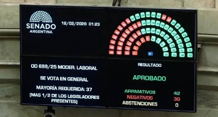 Durante la madrugada de este jueves, el Senado le dio media sanción al proyecto de ley de “modernización laboral” impulsado por el Gobierno de Javier Milei. Pese a que el bloque peronista votó unificado, desmintiendo los rumores de ruptura, el oficialismo logró una aprobación holgada, por 42 votos a favor y apenas 30 en contra. Como se preveía, las negociaciones previas con los gobernadores aliados y toda una serie de cambios y concesiones de último momento lograron darle a La Libertad Avanza (LLA) su primera victoria parlamentaria del año.